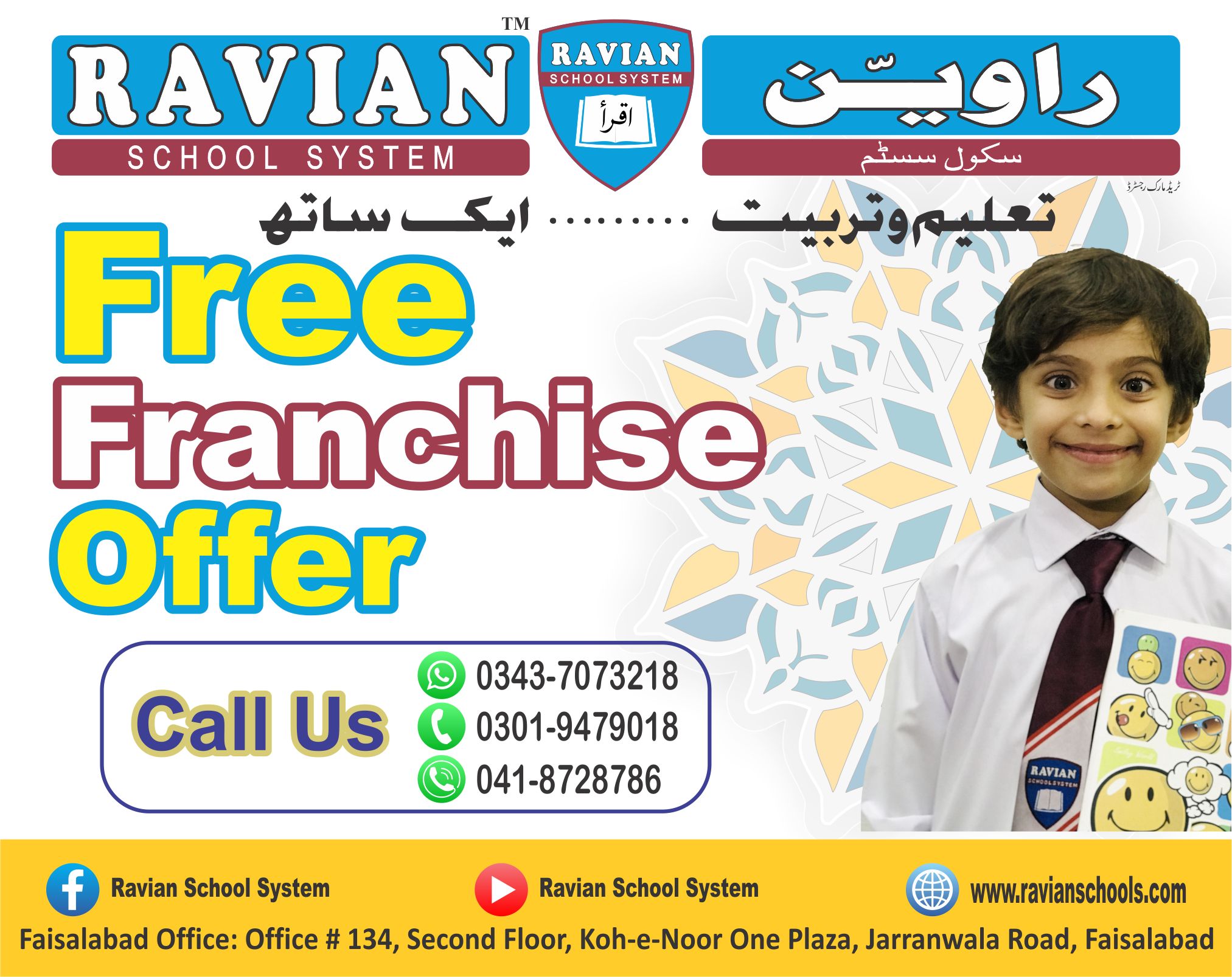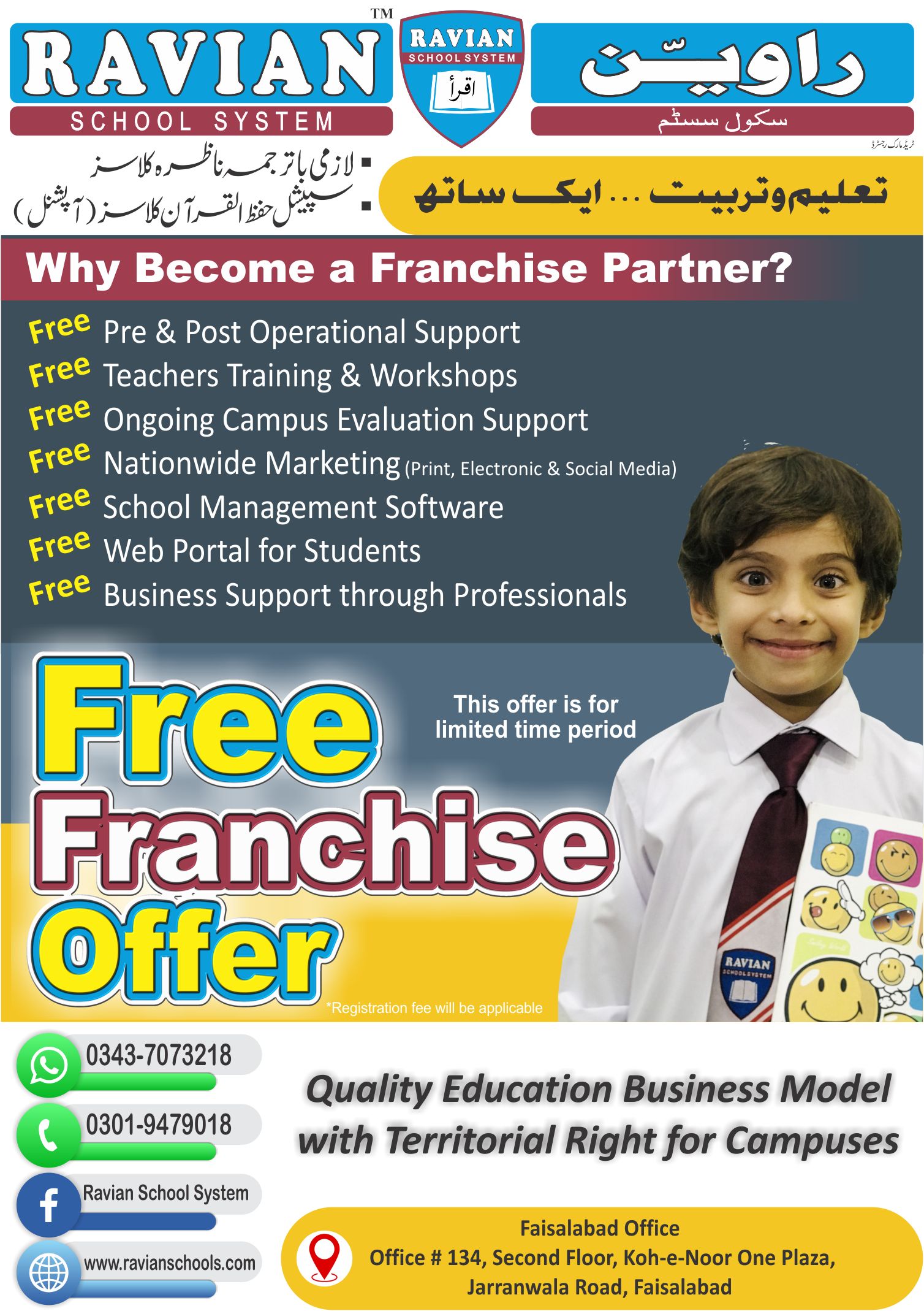 Ravian School System is a registered school system with a registered trademark name and logo. The basic purpose behind Ravian School System is to produce students having skills and education of modern day to day life with Islamic education and practices. We want to educate our students’ the Islamic education, value education and modern education by which our students can become responsible, groomed and successful citizens of Pakistan. We will give regular academic and administrative support to our Network Associates. Centralized school operations and procedures, policies, curriculum, scheme of work, daily lesson plans, resources, and teachers trainings, examination papers, activity calendars. We will help our Network Associates to improve their strengths through a comprehensive monitoring and evaluation program.