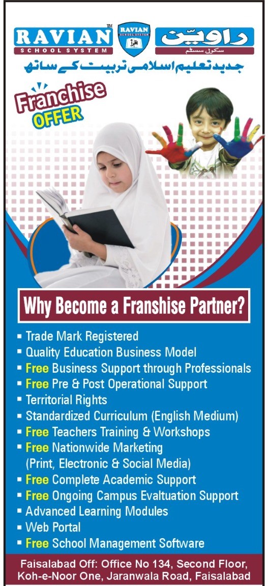 Ravian School System is a registered school system with a registered trademark name and logo.  The basic purpose behind Ravian School System is to produce students having skills and education of modern day to day life with Islamic education and practices.